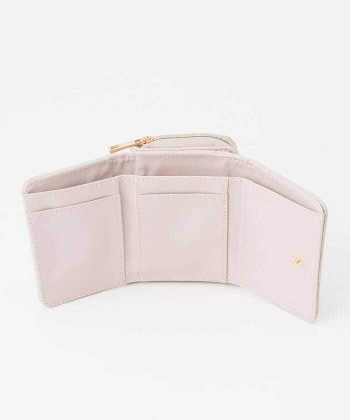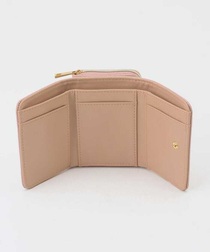 シンプルかつ上品なデザインのジップウォレットは、三つ折りタイプのミニ財布。持ち歩きやすさを重視したコンパクトサイズで、ゴールドプレートがプチプラなのに、高見え効果を出しています。