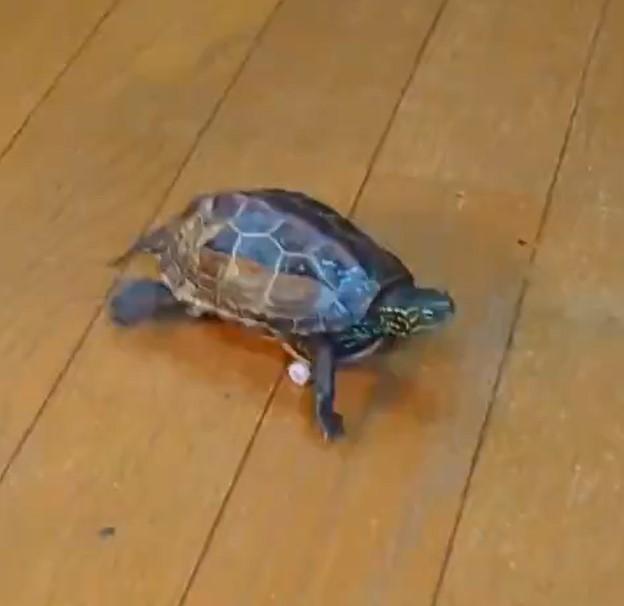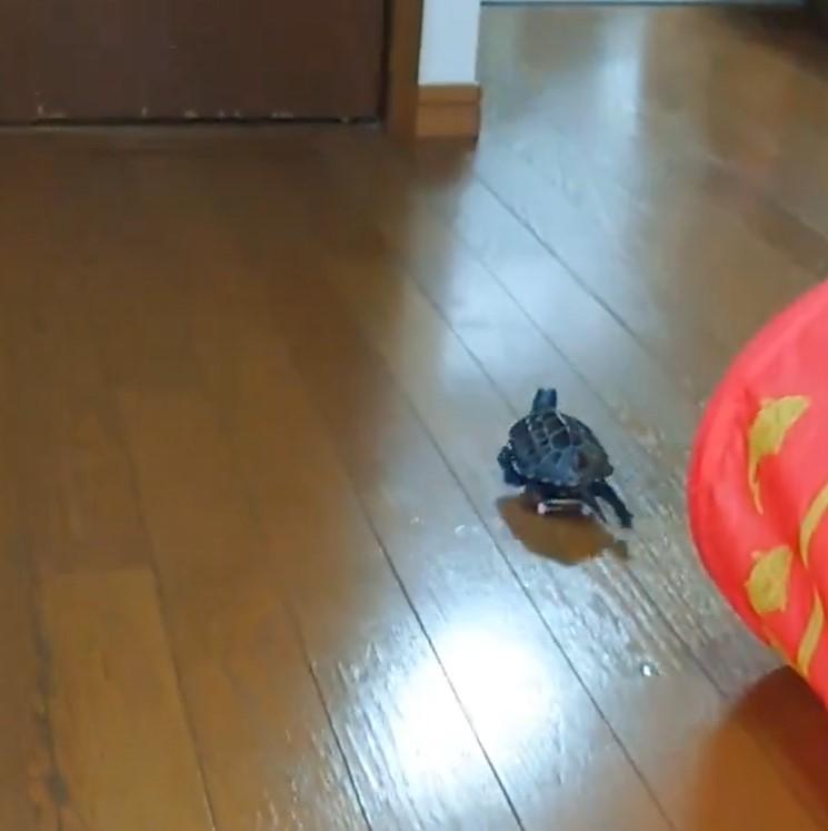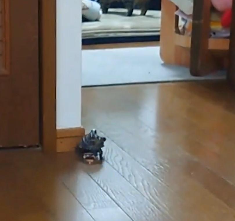 途中で甲羅が壁に当たっても、軍曹くんは器用に方向転換したようです。重心移動の方法をマスターしているようにも見えてきます……!もなちゃんへの愛が伝わる「見事な走り」に、思わず笑顔になる瞬間です。