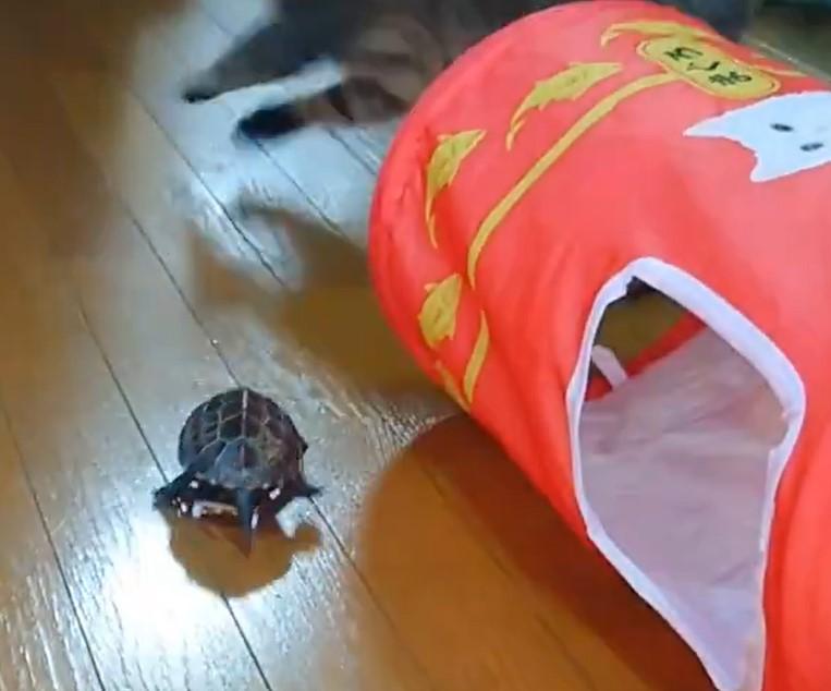 1. 猫が大好きな亀さんの「高速移動」に驚き!