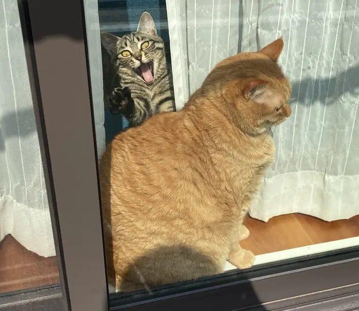 「#面白顔猫選手権」というハッシュタグとともに投稿されたのは、一枚の写真でした。Xで多くの注目を浴びているのは、茶トラ柄の先住猫「すず」くんと、キジトラ猫の「つむぎ」くんです。