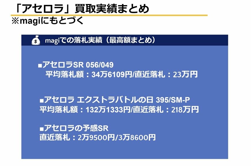 magiでの落札を整理すると、アセロラSR 056/049の平均落札額は34万6109円、アセロラ エクストラバトルの日 395/SM-Pの平均落札額は132万1333円という結果です。※執筆時点