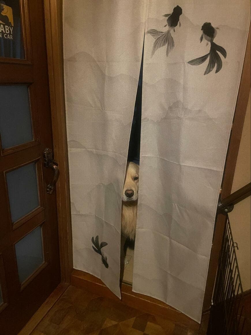 エルモくんは、のれんの隙間から顔半分を出して「ジッ」とこちらを見ていました。身を潜めるように覗いています。「見てるワン……」とでも言いたげな表情に笑ってしまいますね。