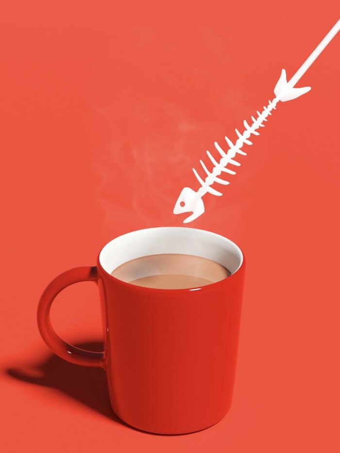 丸々としていたチョコの体がミルクにすっかり溶けてしまい、魚は骨の状態に。魚自身も驚きの表情を隠せないようです。表情まで繊細に表現されており、その様子に思わずクスッと笑ってしまいます。
