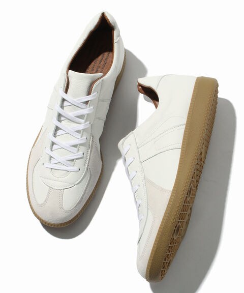 世界中のミリタリーシューズを独自の視点で現代的に再現する『REPRODUCTION OF FOUND』のEDIFICE別注ジャーマントレーナー。内側にエラスティックが仕込まれた、紐なしでも履けるリラックス仕様です。