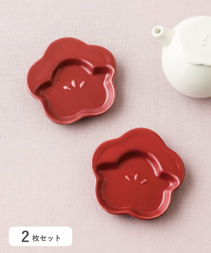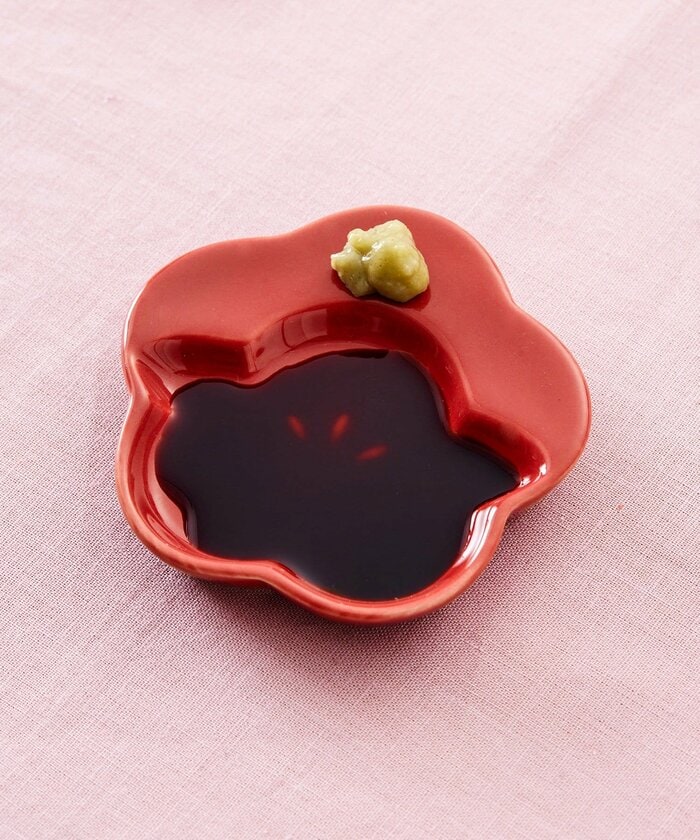 春を感じさせる梅をモチーフにした醤油皿です。シックなレッドがひな祭りにぴったり。高さのある部分にわさびや生姜などの薬味を乗せられるため、醤油と混ざり合うことがありません。