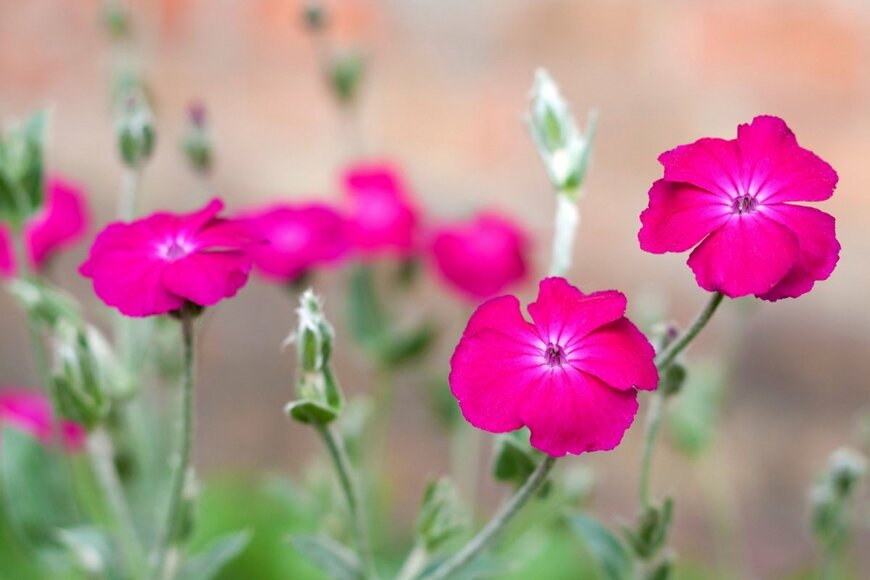 白い綿毛に包まれた葉に、ビロードのような質感で濃いローズカラーの花弁がパッと目を引くリクニス・コロナリア。ホワイトやピンクの花色のものも見られます。