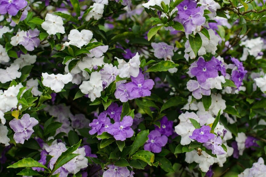 ジャスミンによく似た爽やかな香りのニオイバンマツリ。夜になると強くなる香りも特徴的ですが、なんといっても咲き進むにつれて花色がパープルからホワイトへと変化していく様子が素敵です。
