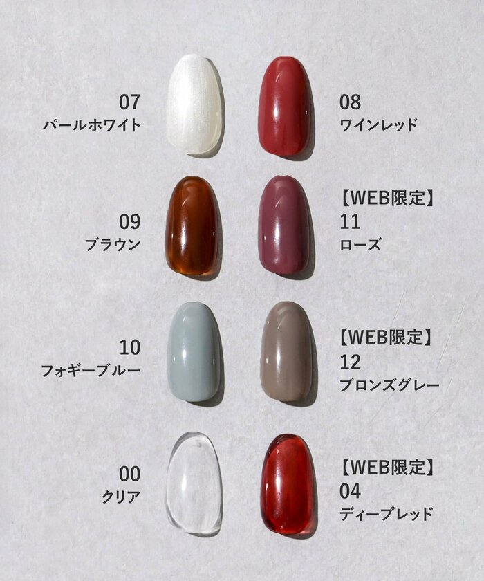 - カラー:パールホワイト、ワインレッド、ブラウン、ローズ(WEB限定)、フォギーブルー、ブロンズグレー(WEB限定)、クリア、ディープレッド(WEB限定)