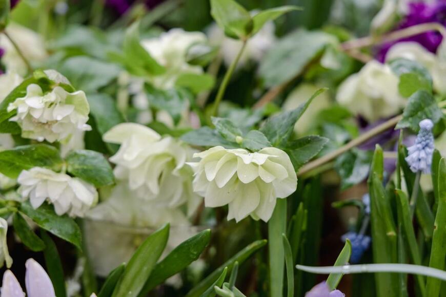 冬~春にかけてのクリスマスローズ最盛期には、できるだけ花の美しさが際立つように、周りの植物は控えめなタイプがオススメ。