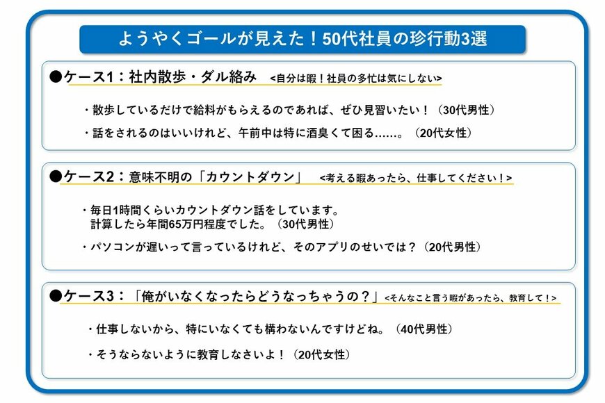 ゴール寸前の50歳代社員は、なぜかカウントダウンを始めることがあります。「定年退職まで、あと〇年だから……」が口癖になりがちに。1時間くらい続くため、「年間65万円程度はカウントダウンでお給料をもらっているのでは?」なんていう声も。