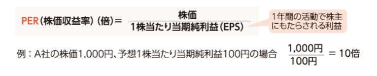 例として、株価1000円で予想1株当たり純利益が100円の場合を考えます。その場合1000円÷100円でPERは10倍となるわけです。