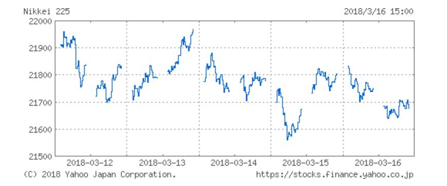 2018年3月16日の東京株式市場で、日経平均株価の終値は、前日より127円44銭安の21,676円51銭となりました。先週初は前週の米雇用統計が良好だったことや米国株が大幅に上昇した流れを受けて、日経平均も12日月曜日、13日火曜日と続伸しました。ところが週半ばからは米国および国内の政治不安が嫌気され売られる展開もありました。