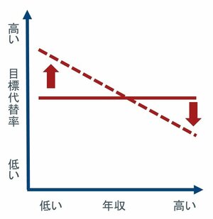 ところで「一律の目標代替率が全ての年収帯の人に当てはまらない」という議論も、米国では多くなされています。そもそも「老後の必要資金として一律の金額が全ての年収帯の人々に適応するものではない」という前提で、年収に対応する目標代替率を提示したわけですが、年収帯によって目標代替率自身が変わるとすれば、もう一歩議論を進める必要があります。