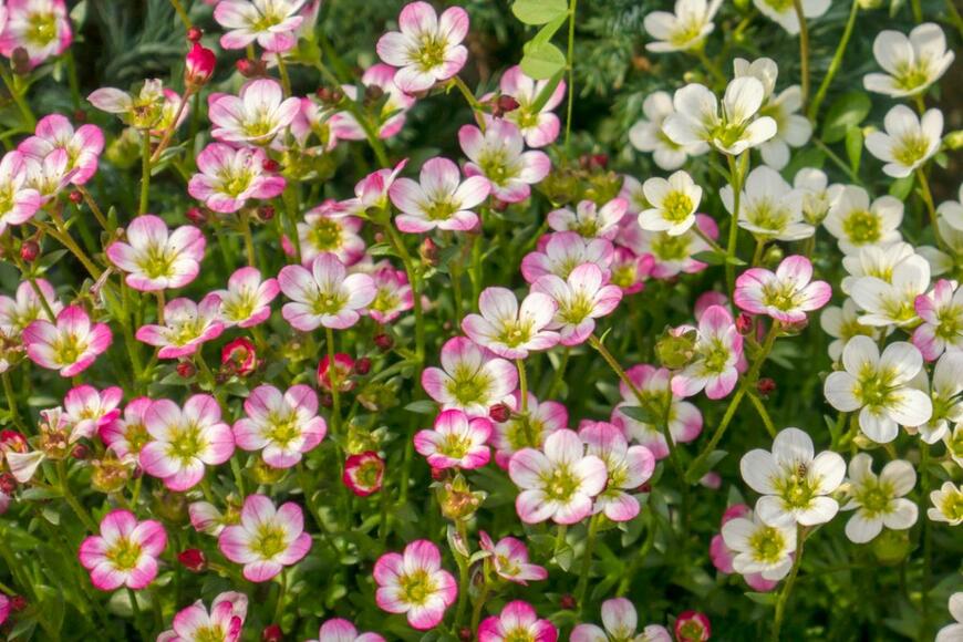 クモマグサはこんもりと茂った葉の上に、ピンクや白の可憐な小花を咲かせるかわいらしい植物。
