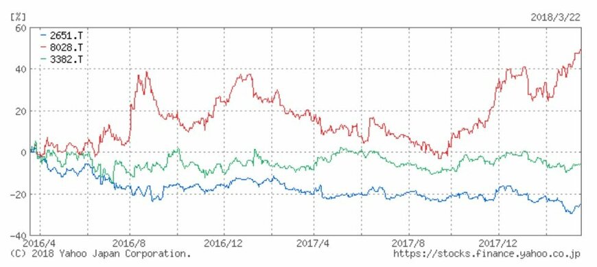 2018年に入ってから、ユニー・ファミリーマートホールディングス(8028)の株価上昇が続く一方で、ローソン(2651)の株価低迷が続いています。