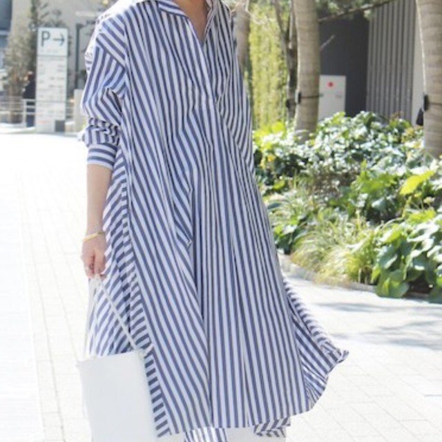 毎シーズン人気のシャツワンピース。Aラインのビッグシルエットと袖のデザインがこなれた印象に。風になびく綺麗なドレープは一枚で着てももちろん、デニムと合わせてもサマになります。