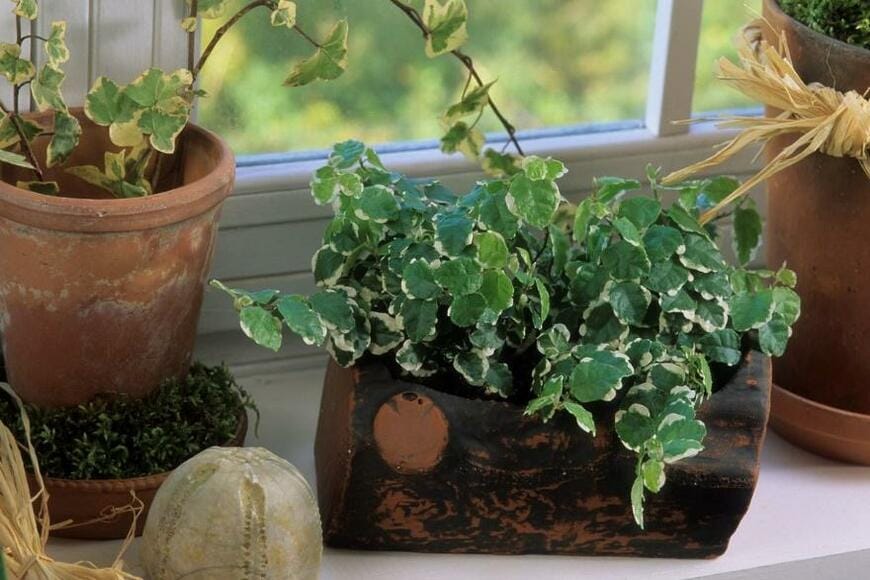 緑の葉に入る白い縁取りが涼しげなフィカス・プミラ。長い茎が横に広がり、小さな葉が密になって茂る様子がオシャレです。