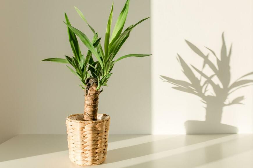 太い幹と元気いっぱいに伸びる葉に生命力があふれ、力強さを感じさせるユッカ。縦方向に伸びるので広い場所を必要としません。