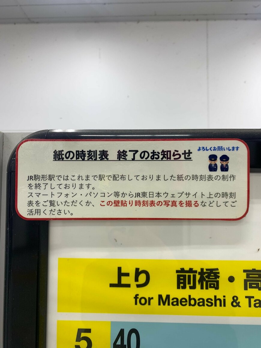 「JR駒形駅ではこれまで駅で配布しておりました紙の時刻表の制作を終了しております」と書かれており、お知らせを見て「この駅でも紙の時刻表がなくなるのか…」と肩を落とした人も少なくないでしょう。