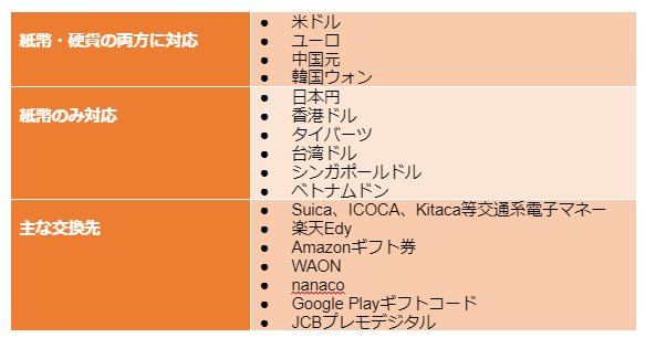 日本を訪れる観光客が多い地域の通貨には、ほとんど対応していることが分かります。交換先も日本国内での移動や買い物に便利なものばかりなので、インバウンドだけでなくアウトバウンドにとっても使い勝手が良さそうです。