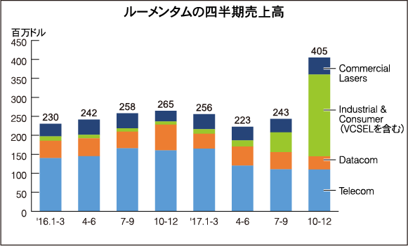 iPhone XにVCSELを供給しているとみられるのが、光デバイスメーカーの米ルーメンタム・オペレーションズだ。17年1~3月期の決算カンファレンスでVCSELに関して「数百万台分の受注を得ている」ことを明らかにし、17年4~6月期には500万ドル分を出荷するとともに「3Dセンシング用に2億台分の受注を得ており、これをすべて17年内に出荷する予定」と述べた。VCSELを含むIndustrial & Consumer分野の売上高は、17年4~6月期の1650万ドルから17年7~9月期は5200万ドル超へ3倍以上に拡大し、17年10~12月期にはさらに4倍増の2.2億ドル(このうち3Dセンシング向けは2億ドル強)を売り上げた。