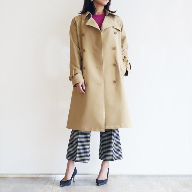 流行に左右されない王道のトレンチコートは、一枚持っていて損はないアイテムですよね。優しい印象のライトベージュと、なめらかな生地感が上品な一着。