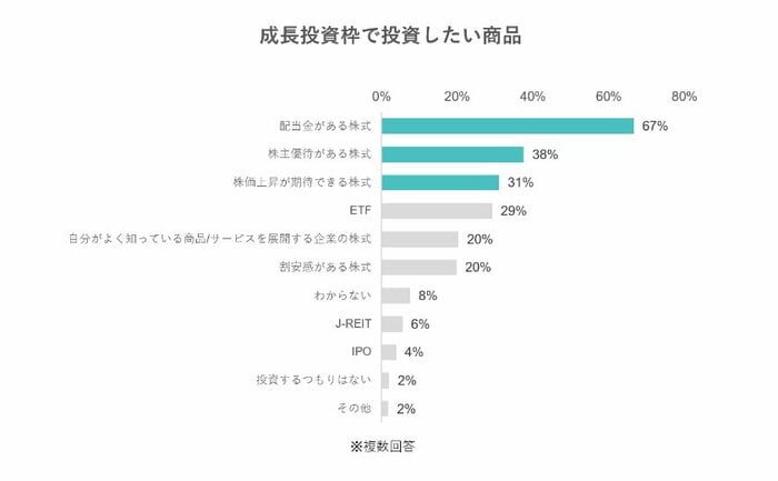 その結果成長投資枠で投資したい商品として「配当金がある株式」という回答が67%で最多となりました。
