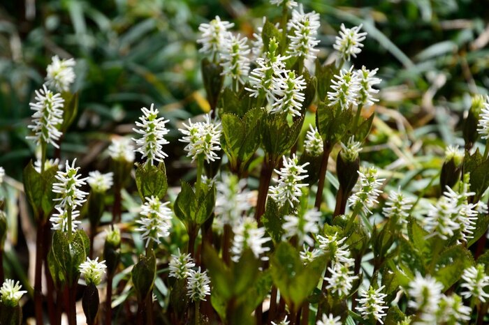 東アジアを原産地とするヒトリシズカ。緑の葉に包まれるように咲く白い花穂の奥ゆかしさは、和の情緒あふれる繊細なたたずまい。