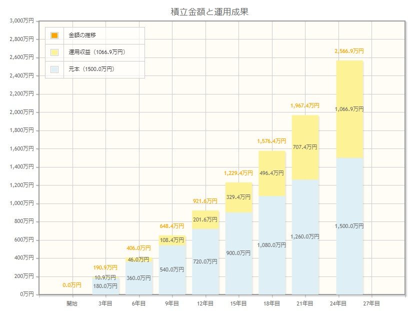 40歳から始めた場合は、65歳まで25年間積み立てることができるので、運用益を含めた運用結果は2566万9348円となりました。