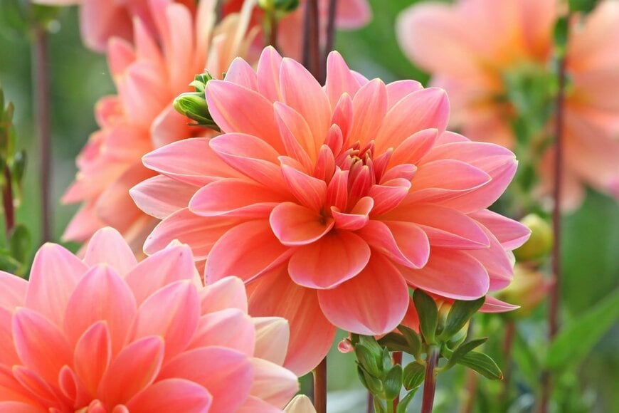 明るい太陽の光が似合うダリア。カラーバリエーションが豊富でカラフル。花の形も一重咲きや変化咲き、大輪種から小輪種まで非常に沢山の品種があります。なかにはチョコレートの香りがするユニークなものも。