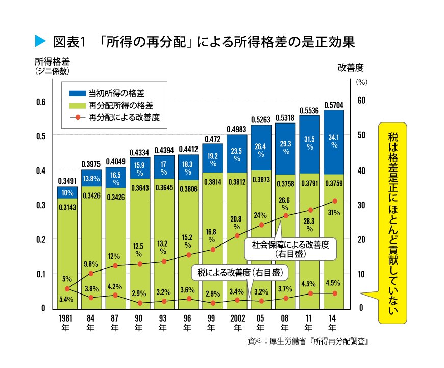 格差の拡大については、厚生労働省がほぼ3年おきに実施し、所得格差の程度を「ジニ係数」という数値で示す「所得再分配調査」で、その実態がよくわかる。ジニ係数は、所得分配などの均等度を示す代表的な指標で、0~1の範囲で示される。0に近いほど所得格差が小さく、1に近いほど大きい。同調査によると、図表1(別画像)に示すように、税が源泉徴収されていない給与など当初所得における格差を示すジニ係数は14年に0.5704と、世界最貧国並みの極めて危険なレベルだ。しかし、年金や医療・介護・保育・恩給・雇用保険・生活保護など社会保障による所得再分配が働き、その効果が大きい(14年に改善度31%)ため、再分配所得の格差は0.3759へと改善している。