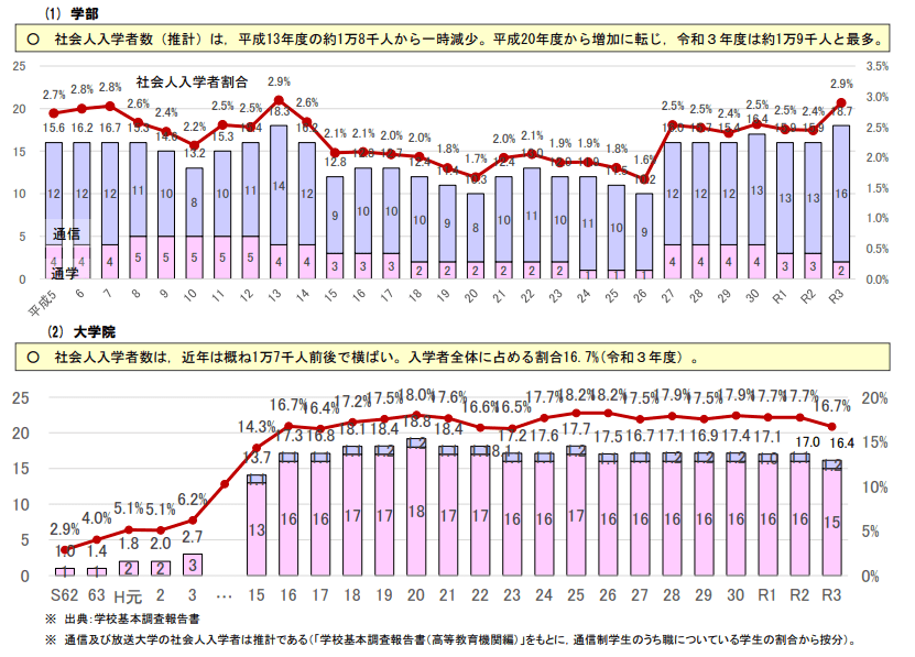 ちなみに、大学院の社会人入学者数は、近年概ね1万7000人前後で横ばい。同じく2021年度の入学者全体に占める割合は16.7%を占めています。