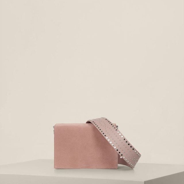 ちょこんとしたサイズ感とカラーリングが可愛らしいバッグ。カウレザーとウエスタン調のスタッズベルトで一見辛口なのに、スウェード素材の柔らかさと優しい色味でフェミニンな印象もある、いいとこ取りなバッグです。