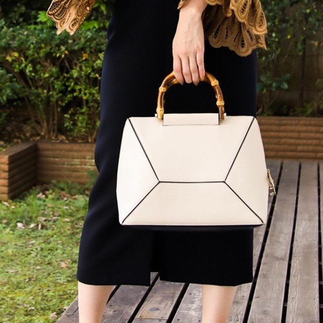 立体的なデザインがオシャレな重厚感のあるスクエアバッグ。バンブー素材の持ち手がアクセントになっています。マチがあるから荷物がたくさん入るところも嬉しいポイント。