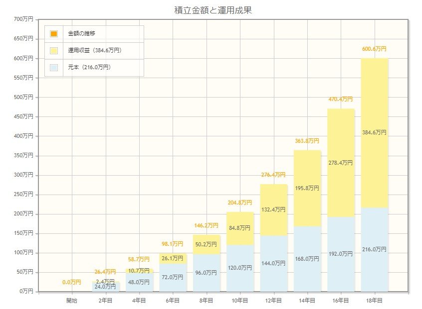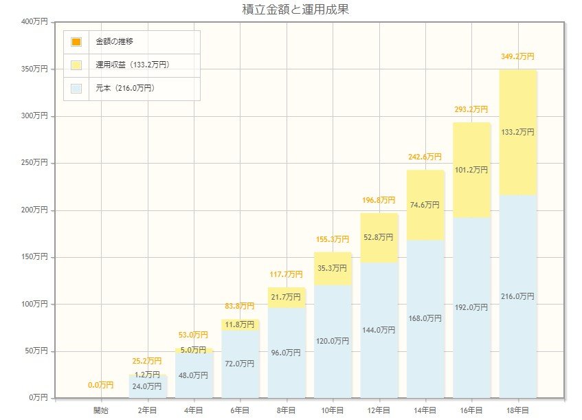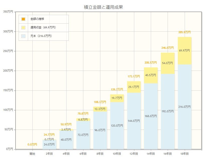 毎月1万円ずつ、18年間積み立てた場合、元本は216万円貯まります。