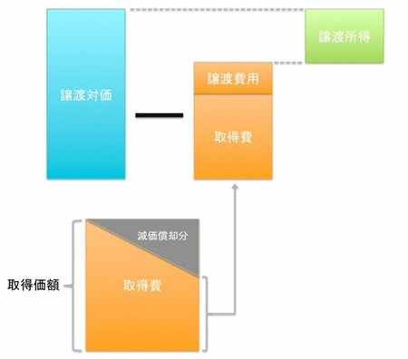 ちょっと込み入った話ですが(この章は読み飛ばしても大丈夫です)、厳密に言うと「取得費=購入金額+費用」ではありません。取得費から毎年の「減価償却部分」を差し引く必要があるのです。