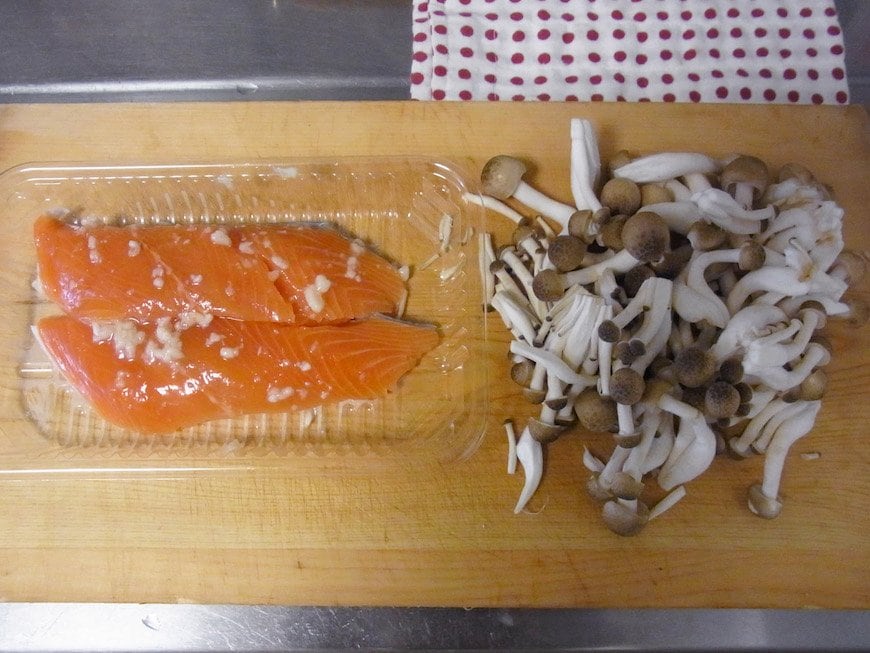 - サケに塩麹をまぶす。しめじは石突きを切り落としてほぐしておく。酒粕は耐熱容器に入れて電子レンジで10秒ずつ加熱して柔らかくし、水と混ぜておく。