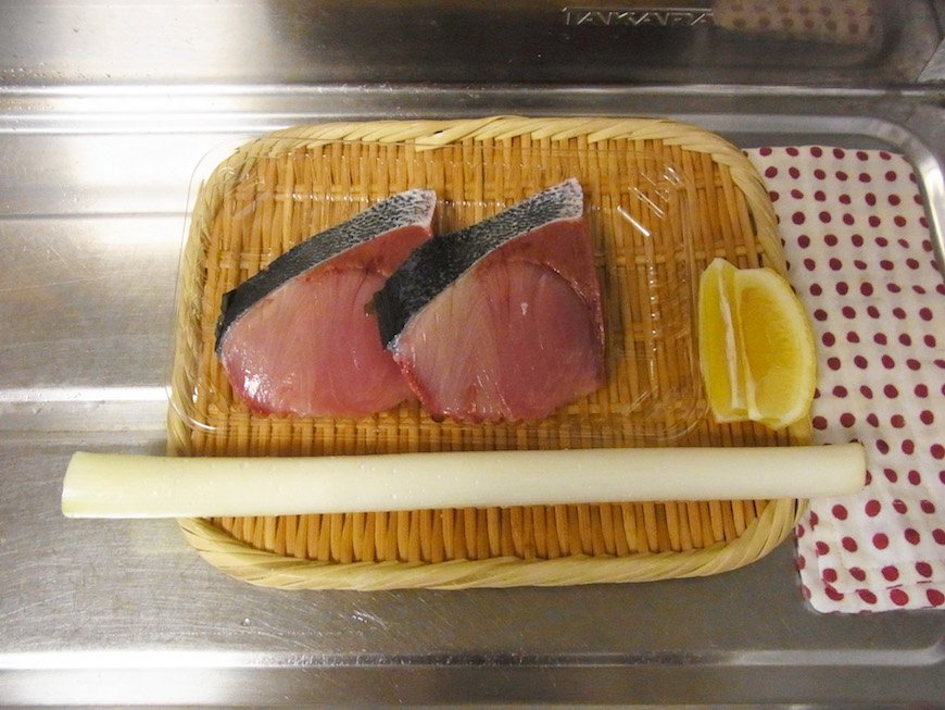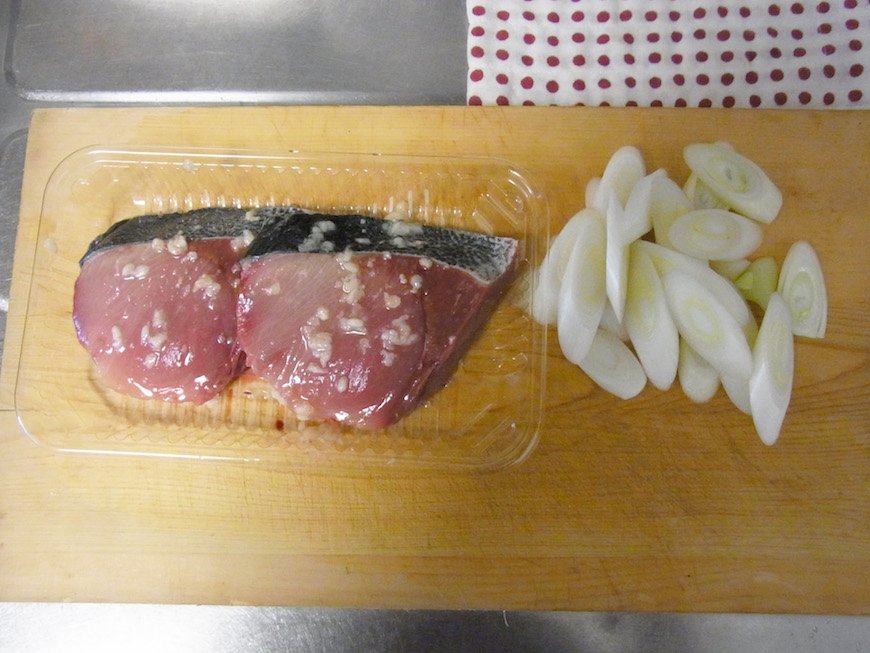 - ブリに塩麹をまぶす。長ねぎは斜めに2〜3㎜幅で切っておく。