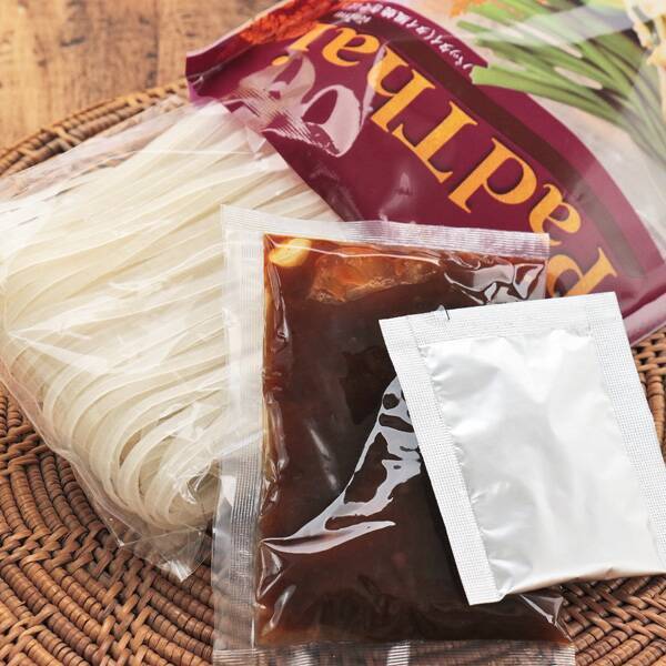 - 原材料名:パッタイペースト(砂糖、魚醤、タマリンド、エシャロット、にんにく、食酢、唐辛子、ピーナッツ、食塩)、米麺(米、でん粉)、チリパウダー(唐辛子、食塩)/調味料(アミノ酸)、加工でん粉、パプリカ色素