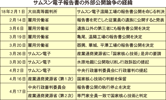 しかし、産業通商資源省(日本の経済産業省に相当)は4月17日、半導体専門委員会を開いて、サムスン電子半導体事業場の「作業環境測定報告書(以下、報告書)」には「30nm以下のメモリー半導体製造技術など国家核心技術が含まれている」と結論づけて、報告書の公開を牽制した。