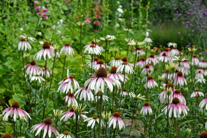 エキナセアはユニークな花の形が楽しめる宿根草。中心部がイガグリのように盛り上がり、花弁が傘のように下垂しているのが特徴です。