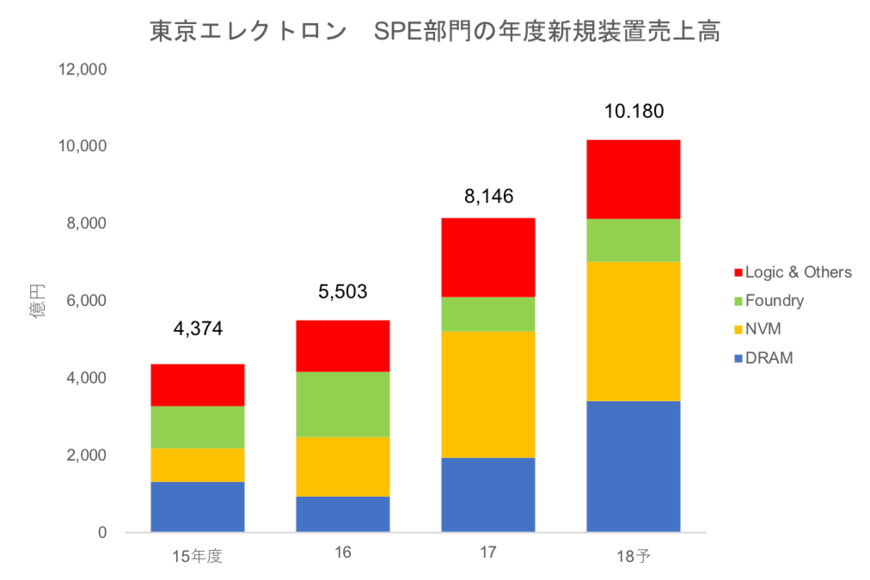 18年度通期業績予想は、売上高が前年度比24%増の1兆4000億円、営業利益が同30%増の3660億円を計画する。主力のSPE(半導体製造装置)部門は、売上高で同22%増の1兆2880億円を計画。同部門における新規装置のアプリケーション別構成比はDRAMが33%、NVM(Non Volatile Memory)が35%、ファンドリーが11%、ロジックその他が20%を見込む。前年度との比較ではDRAMの構成比が上昇(9ポイント増)しており、金額ベースでは前年度比74%増の大きな伸びとなりそうだ。