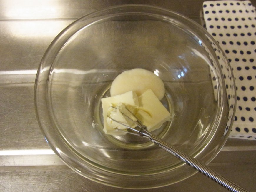 - クリームチーズを耐熱容器に入れ、電子レンジで様子を見ながら10秒くらい加熱する。加熱しすぎるとはじけることがあるので、チリチリと音がしたらすぐ止める。