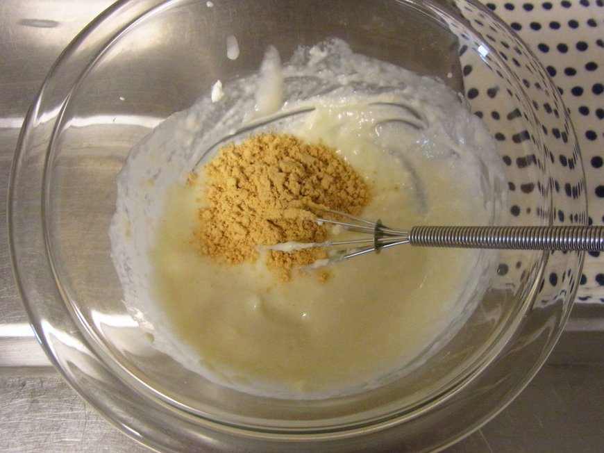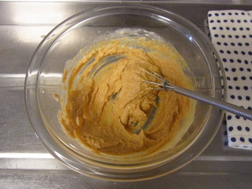 - 柔らかくなったクリームチーズをよく混ぜながら、甘酒を少しずつ加える(一度に加えると混ぜにくくなる)。