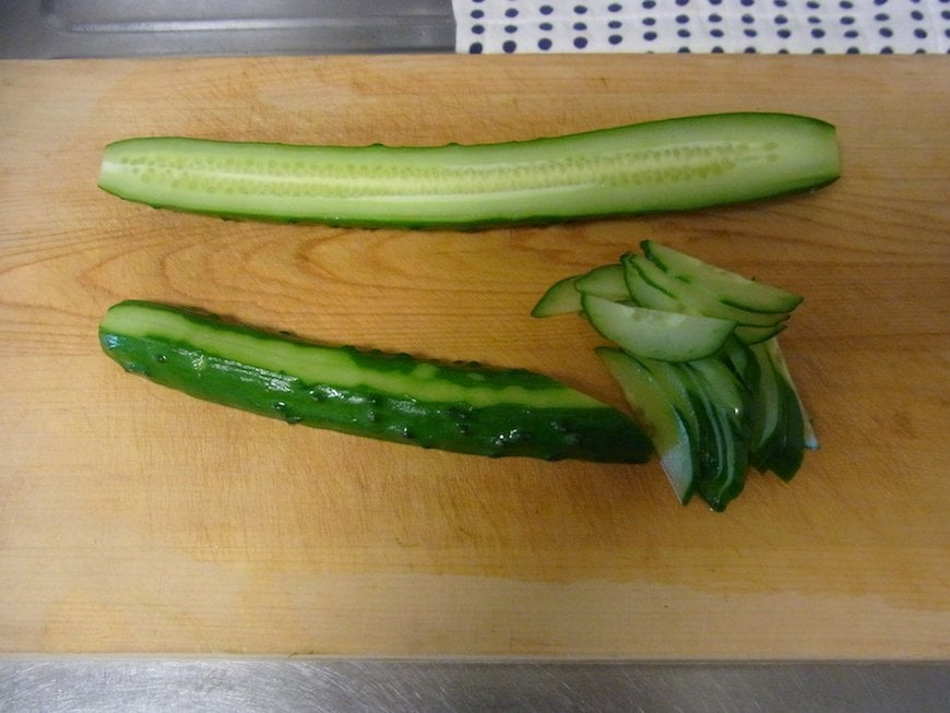 - きゅうりは、しま模様に皮をむき、たて半分に切ったあと斜めに薄く切る。