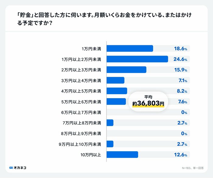 最後に「この春(2024年3月~現時点)を機にご自身で始めたこと・始めてみたいこと、より一層お金を費やしたいこと」という質問で「貯金」と回答した方に対して「月額いくらお金をかけている、またはかける予定ですか?」と質問。