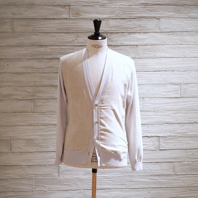 前身頃のフェイクスエードとニットの切り替えが特徴的な『EDIFICE LA BOUCLE』のカーディガン。生地にカシミヤを織り混ぜることで、滑らかな肌触りを実現した一枚です。