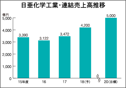 18年度(18年1~12月)は、売上高を前年比21%増の4200億円と計画する。うち、光半導体事業は同9%増の3000億円、化学品事業は同67%増の1200億円。LEDを中心に海外メーカーとの競争激化が影響し、利益率では苦戦するが前年同等水準の利益を確保したい考えだ(17年度経常利益は658億円)。
