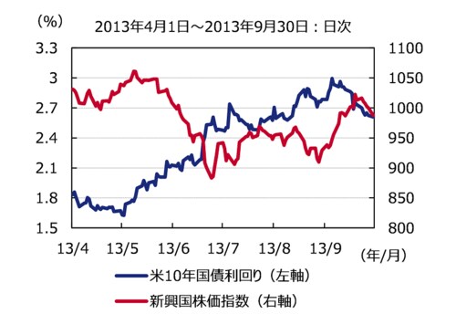 まず、バーナンキ・ショック時には、利回りは約4カ月間上昇したのですが、新興国株価指数の下落は前半に大きくなっています(図表2)。