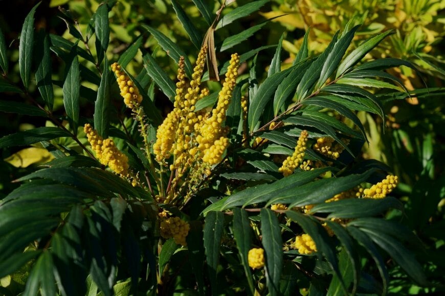 細くスタイリッシュな葉がふんわりと広がるマホニアコンフューサは、ひと株植えるだけでおしゃれな雰囲気を演出してくれる常緑低木。花が少なくなる秋から冬に、花茎をすっと伸ばし、鮮やかな黄色い花を咲かせてくれるのも嬉しい特長です。